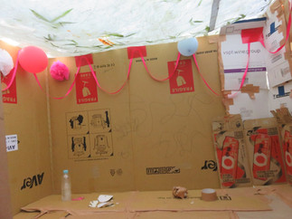 のこぎりで切った竹を紐で結んで組み立てたり、段ボールをガムテープで張り合わせたり。