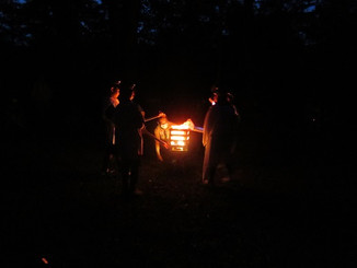 そのあとは、お待ちかねキャンプファイヤー。今回は腕に覚えのあるデンリーダーがつくってくれたLED営火でキャンプファイヤーです。LEDだからといって侮ることなかれ。光量も十分、赤い炎がゆらゆらとゆらめく本格仕様です。とてもいい雰囲気出てます。
